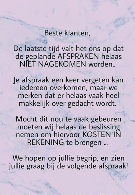Mocht je een afspraak moeten verplaatsen dan dien je er rekening mee te houden dat je niet in dezelfde week nog geholpen kan worden.